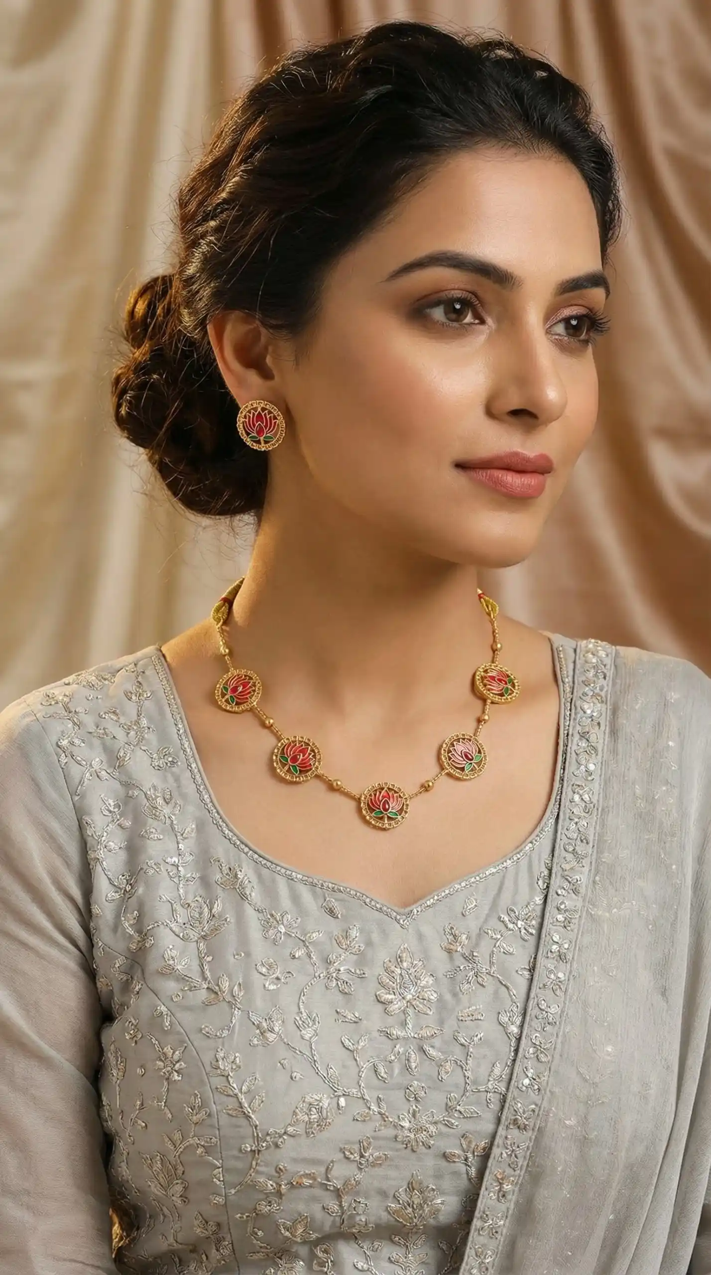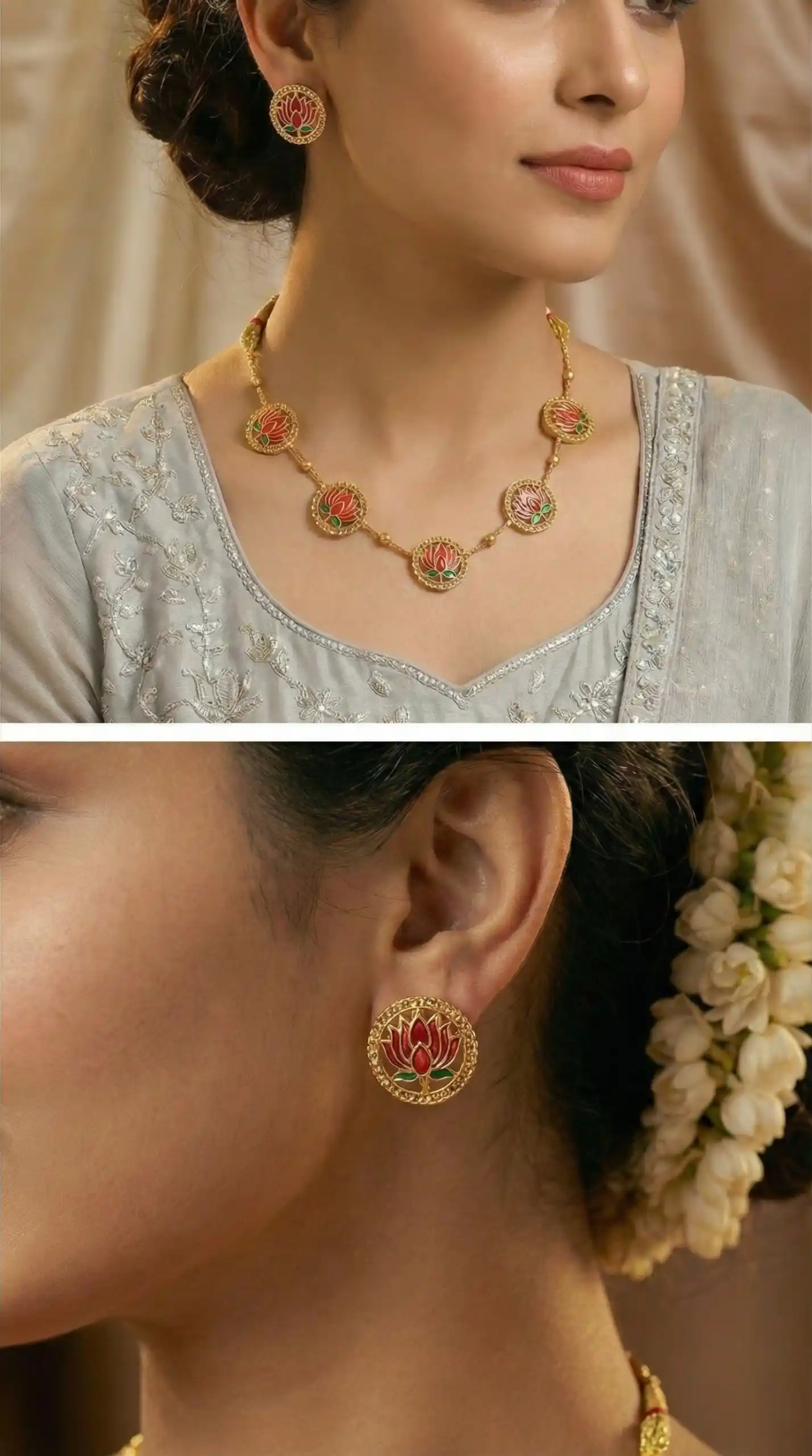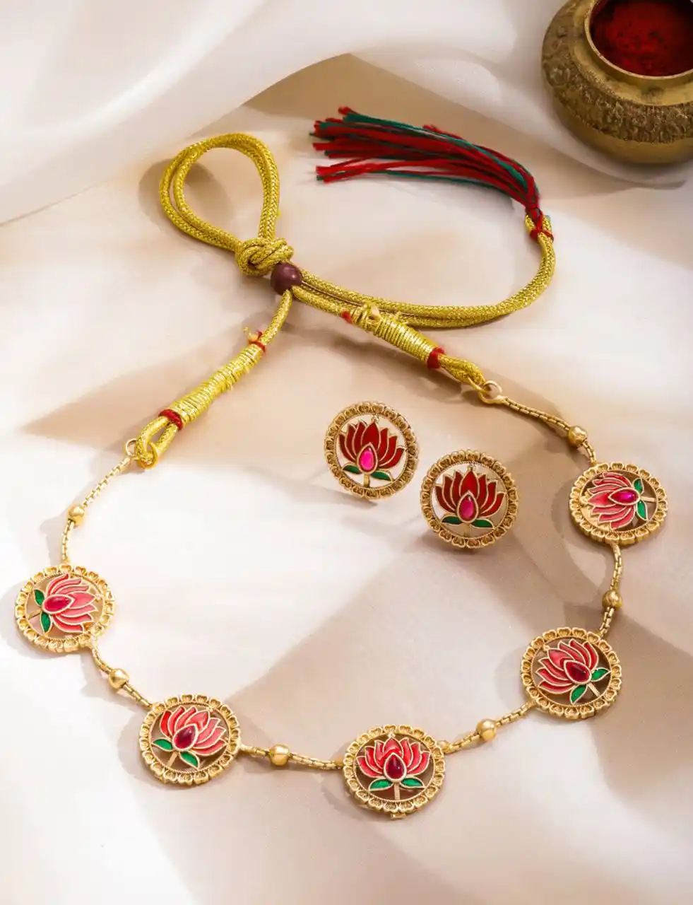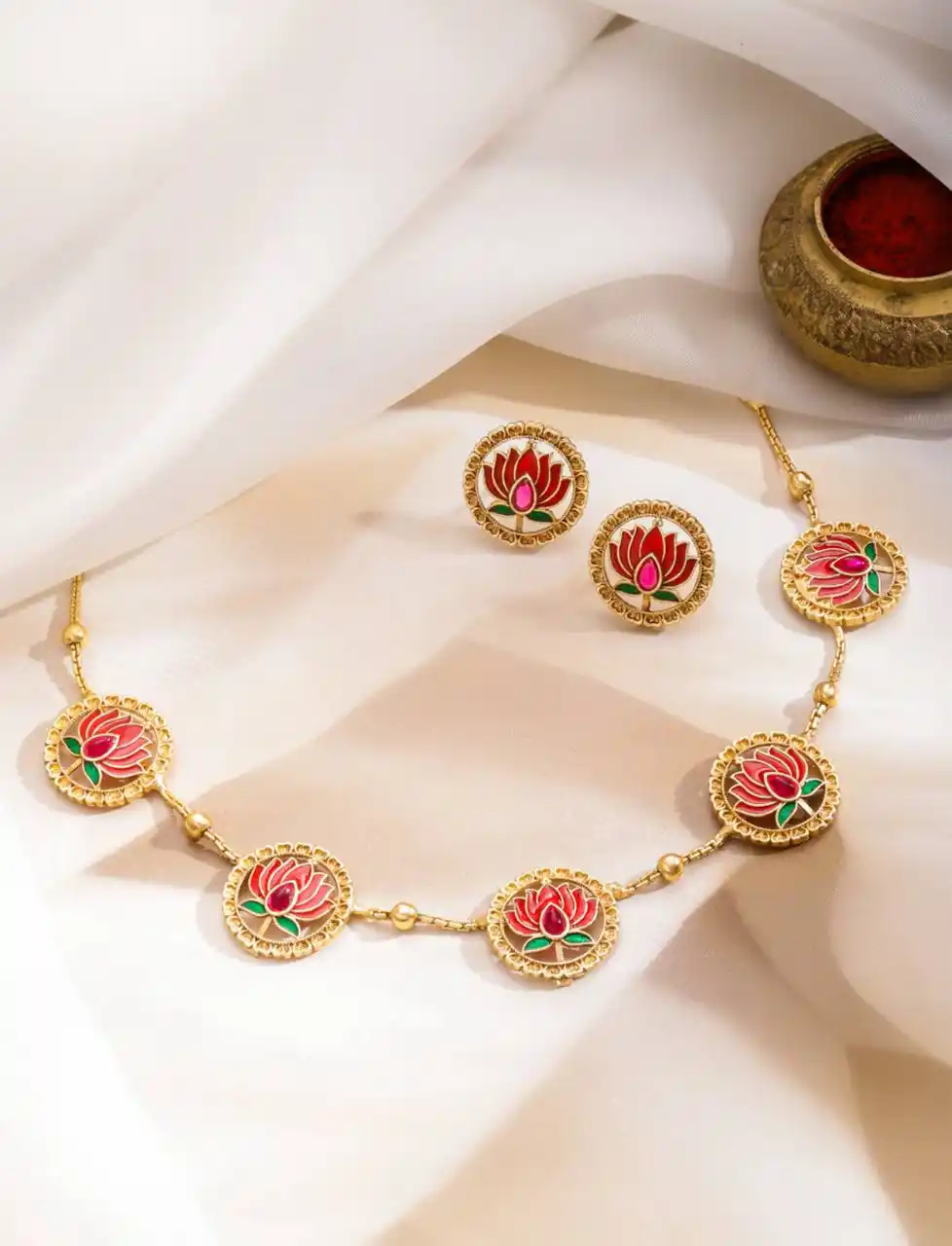 High Gold Plated Meena Work Pink Lotus Necklace with Earrings for Women
